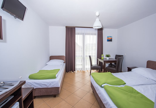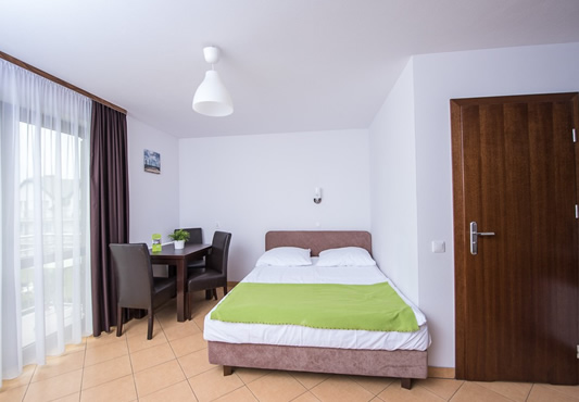 Pokoje z łazienkami i balkonami wyposażone są w wygodne łóżka małżeńskie (160x200) lub pojedyncze (80x200), TV Cyfrowa naziemną, lodówkę, czajnik bezprzewodowy, zestaw naczyń oraz sprzęt plażowy (koc i parawan).